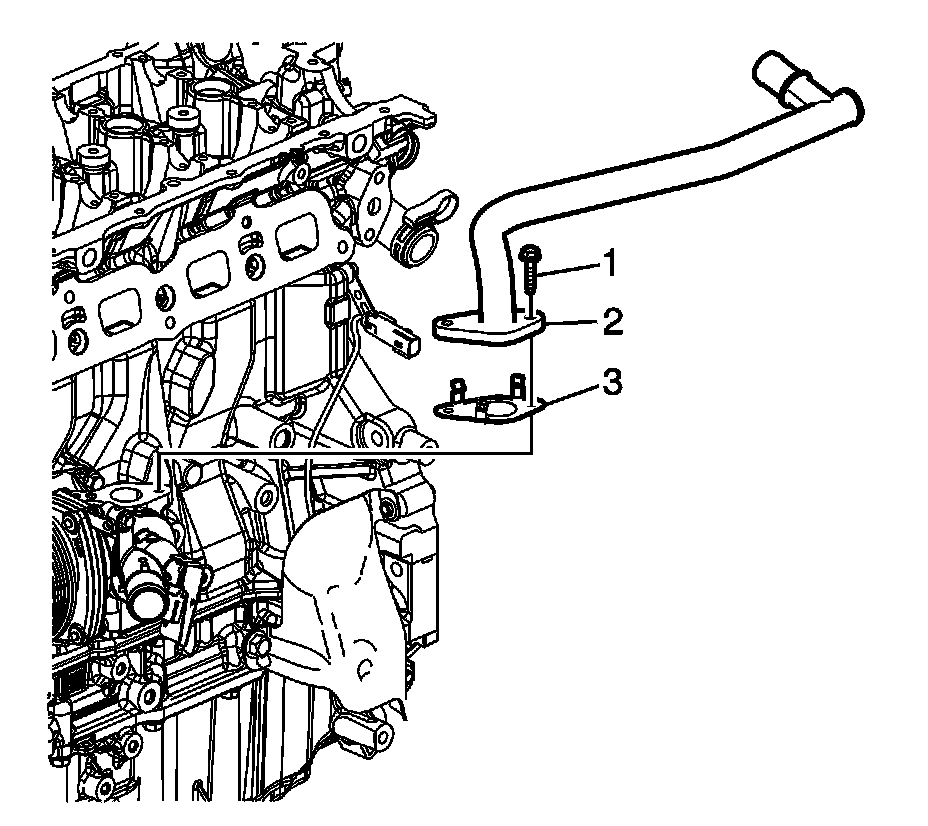 11. Install a NEW thermal bypass pipe gasket (3) on the thermal bypass pipe. Install the thermal bypass pipe to the water pump assembly. Install the bolts (1) and tighten to 10 Nm (89 lb in).