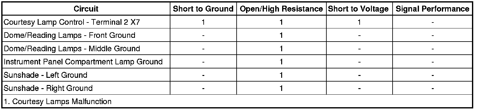 The body control module (BCM) supplies battery voltage to the dome/reading lamps, left and right sunshade lamps, and instrument panel compartment lamp via the courtesy lamp control circuit. When the instrument panel compartment or a sunshade mirror is opened, the switch contact close allowing battery voltage to flow illuminating the respective lamps. The front reading lamps are controlled by individual switches that are activated by the operator when additional cabin lighting is required. In the event that any of these courtesy lamps were to remain illuminated for more than 10 minutes with the ignition switch in the OFF position and no doors opened, the BCM will deactivate the courtesy lamp control circuit to prevent total battery discharge.