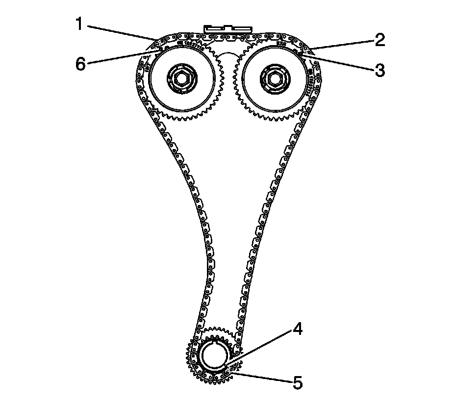 2. The unique colored link (5) is aligned to the timing mark on the crankshaft sprocket (4).