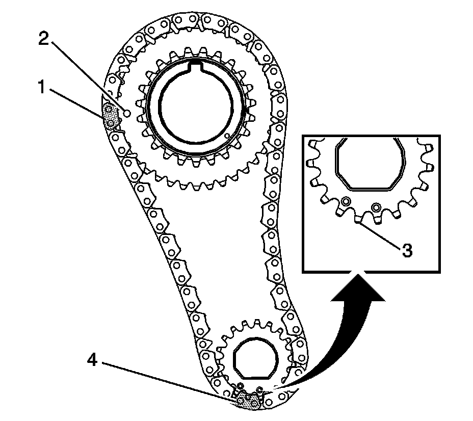 2. The adjacent timing links (4) are aligned with both timing marks (3) on the balancer shaft driven sprocket.