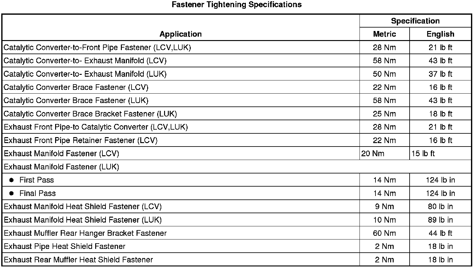 Fastener Tightening Specifications