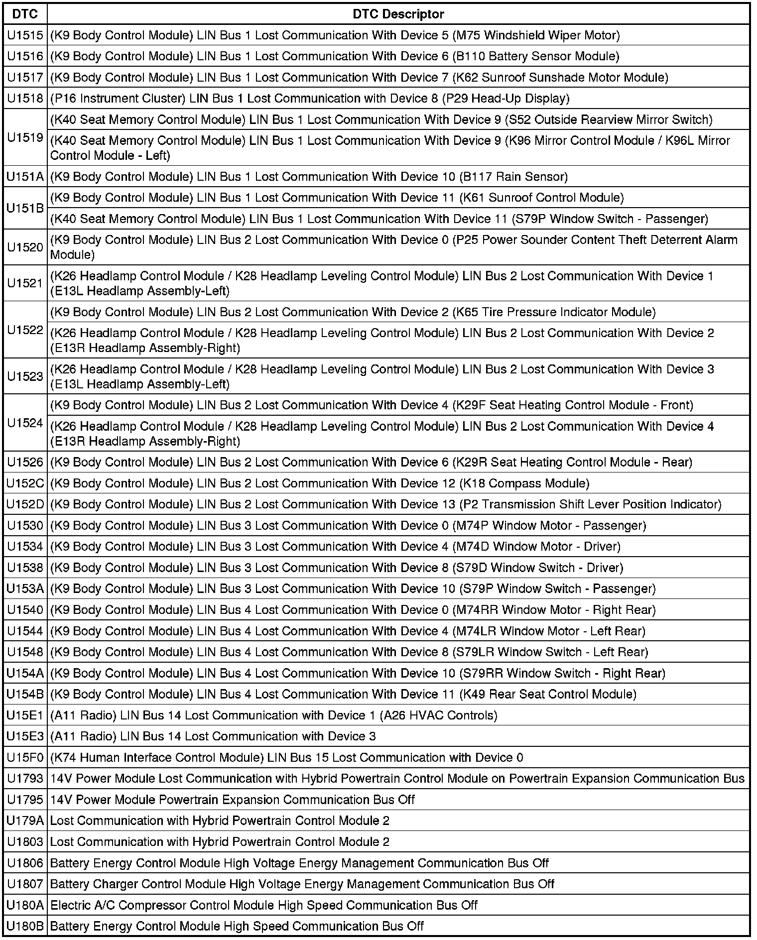 This list includes all Data Communications related U-code DTCs in alphanumeric order with descriptors for all devices. Not all DTCs listed will be applicable to all vehicles.