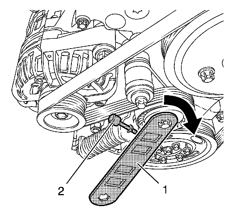 2. Move the drive belt tensioner clockwise until EN-955-20 - locking pin (2) can be removed. Use EN-48488 - wrench (1).