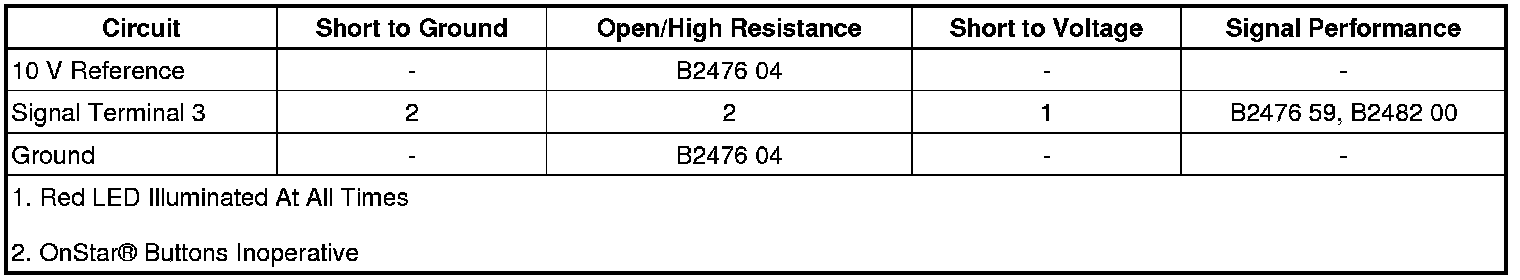 The OnStar(R) button assembly consists of 3 buttons: Call/Answer, OnStar(R) Call Center, and OnStar(R) Emergency. The telematics communication interface control module supplies the OnStar(R) button assembly with 10 V via the keypad supply voltage circuit. Each of the buttons, when pressed, completes the circuit across a resistor allowing a specific voltage to be returned to the telematics communication interface control module over the keypad signal circuit. Depending upon the voltage range returned, the telematics communication interface control module is able to identify which button has been activated.