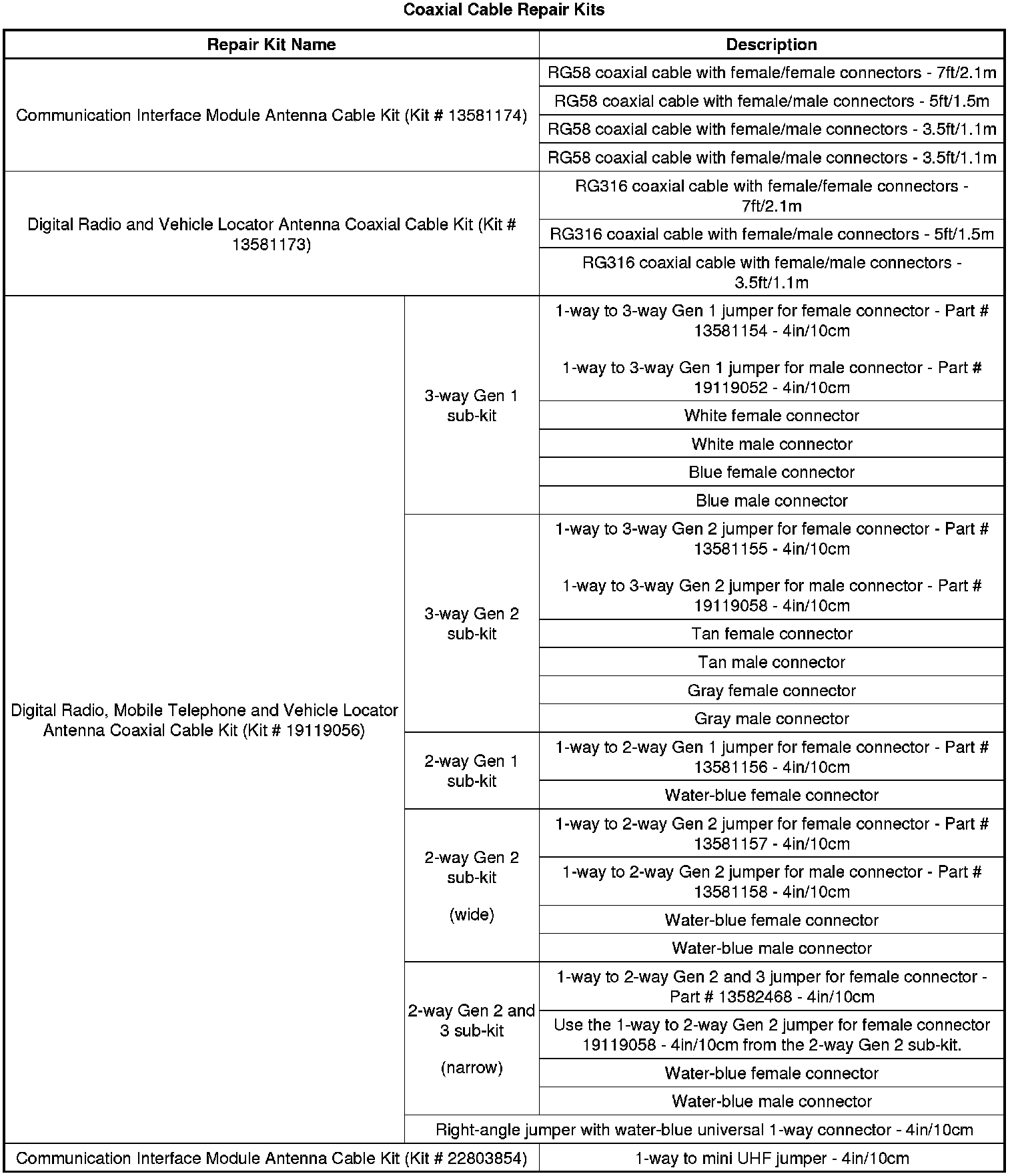 * Communication Interface Module Antenna Cable Kit (Kit # 13581174) is used to repair Cellular coaxial cables. This kit uses RG58 low loss coaxial cables that are available in four lengths. The coaxial cables can be attached together in various lengths to closely match the length of the faulty/damaged coaxial cable.