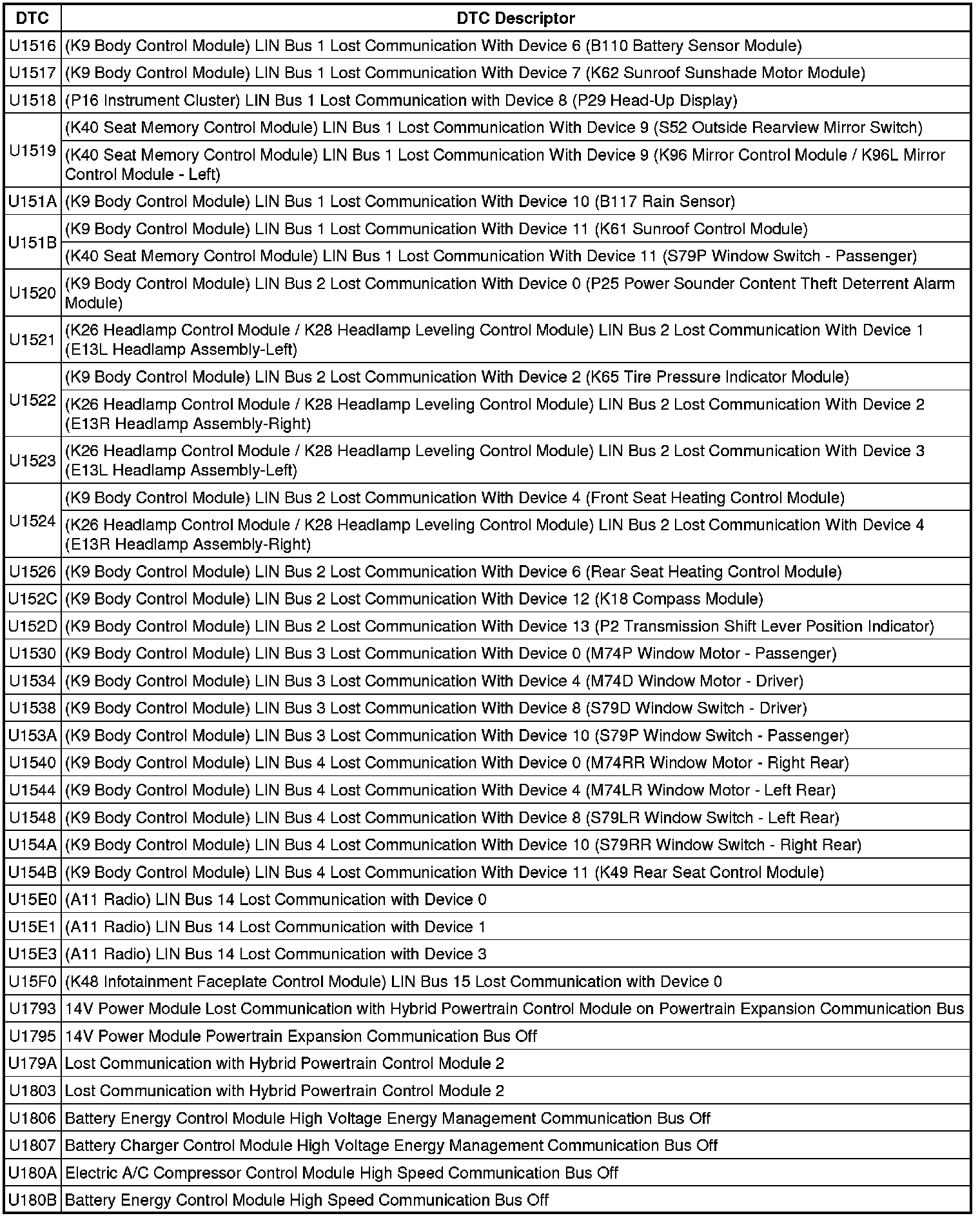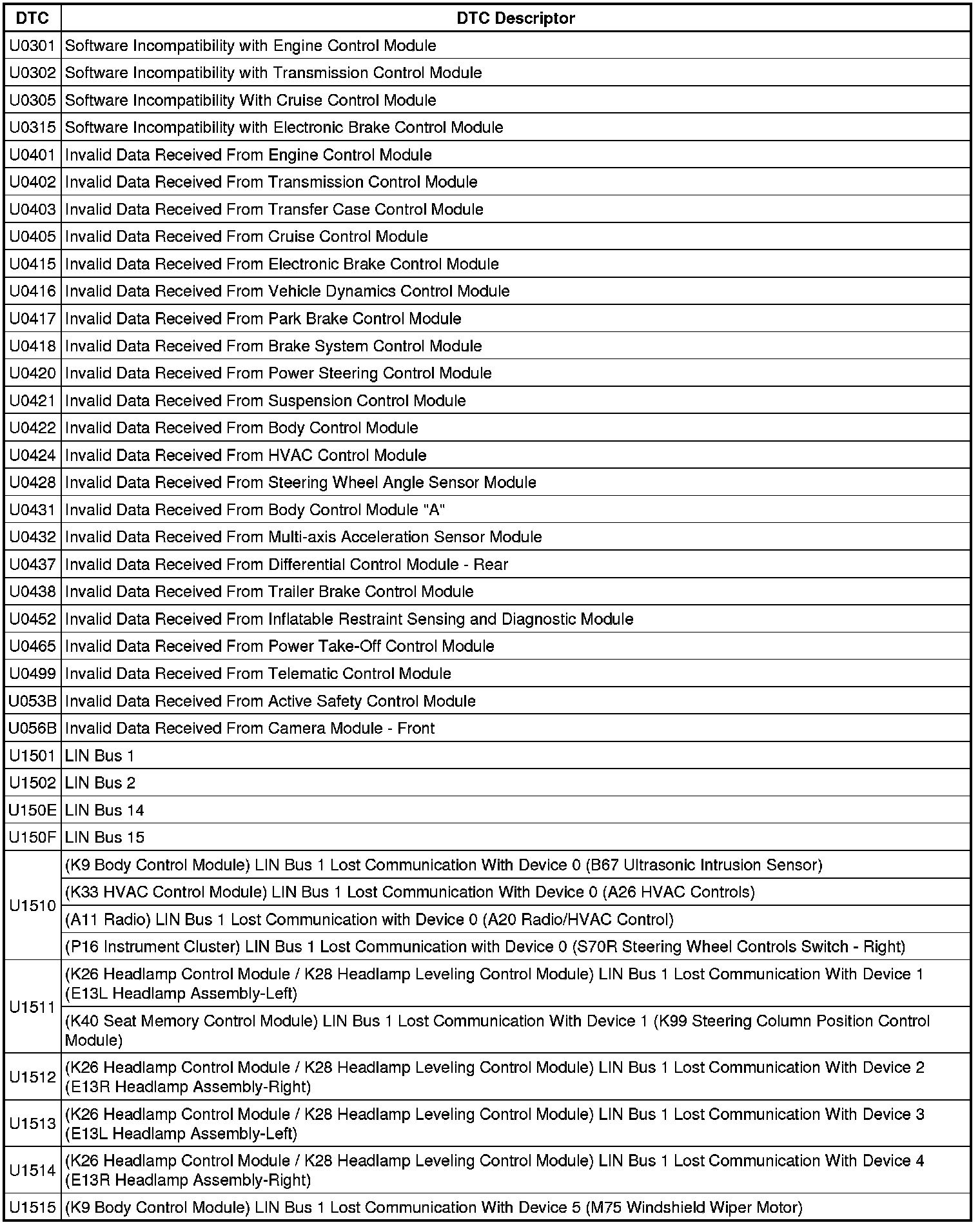 This list includes all Data Communications related U-code DTCs in alphanumeric order with descriptors for all devices. Not all DTCs listed will be applicable to all vehicles.