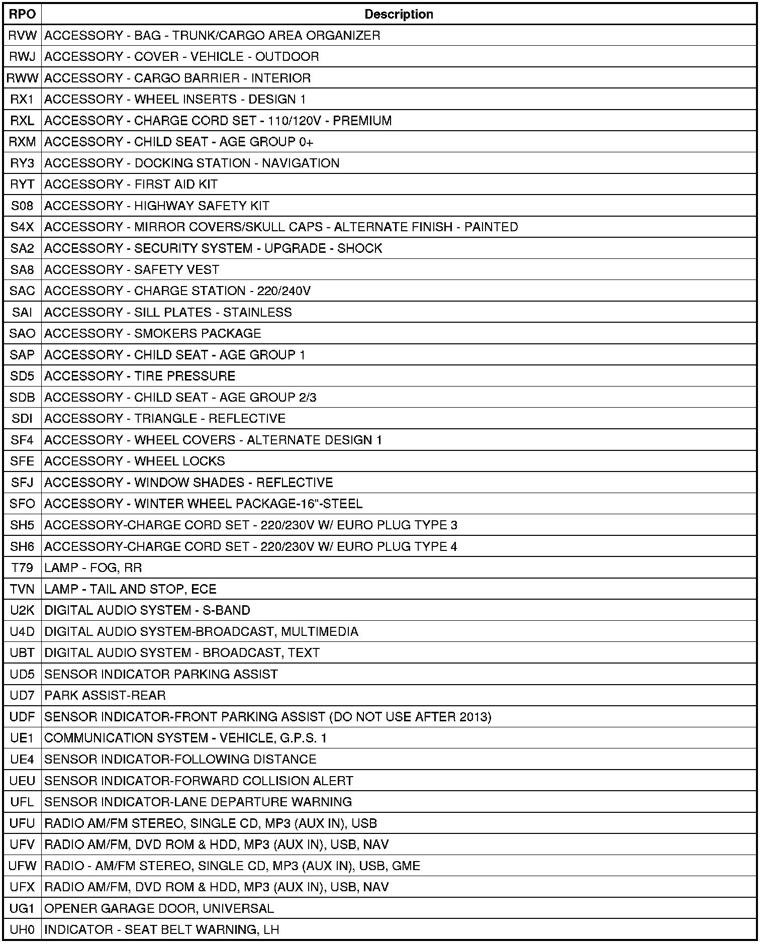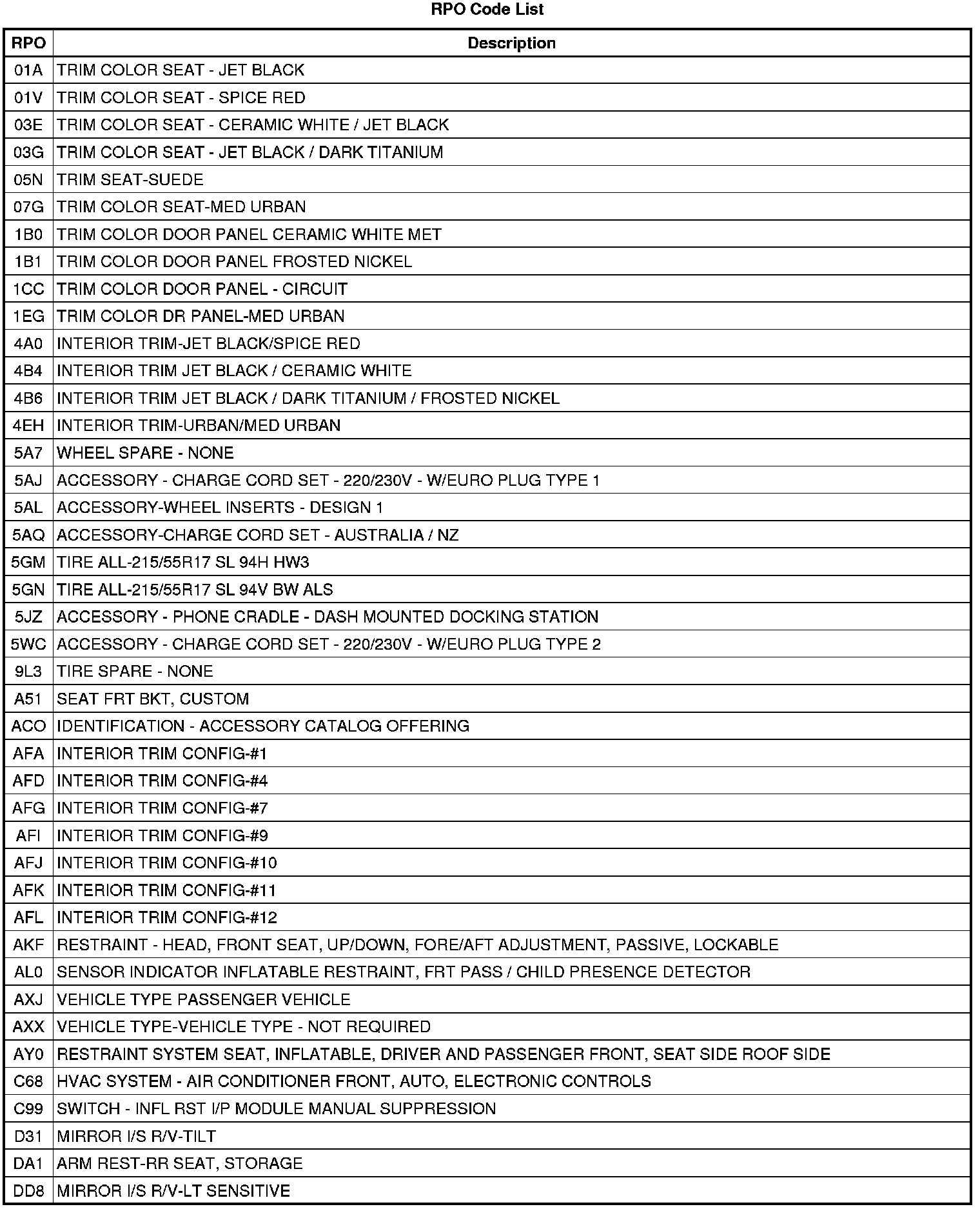 RPO Code List