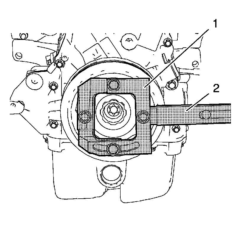 4. Install EN-49979 - retainer (1) in compound with EN-956-1 - extension (2) to the crankshaft balancer as shown.