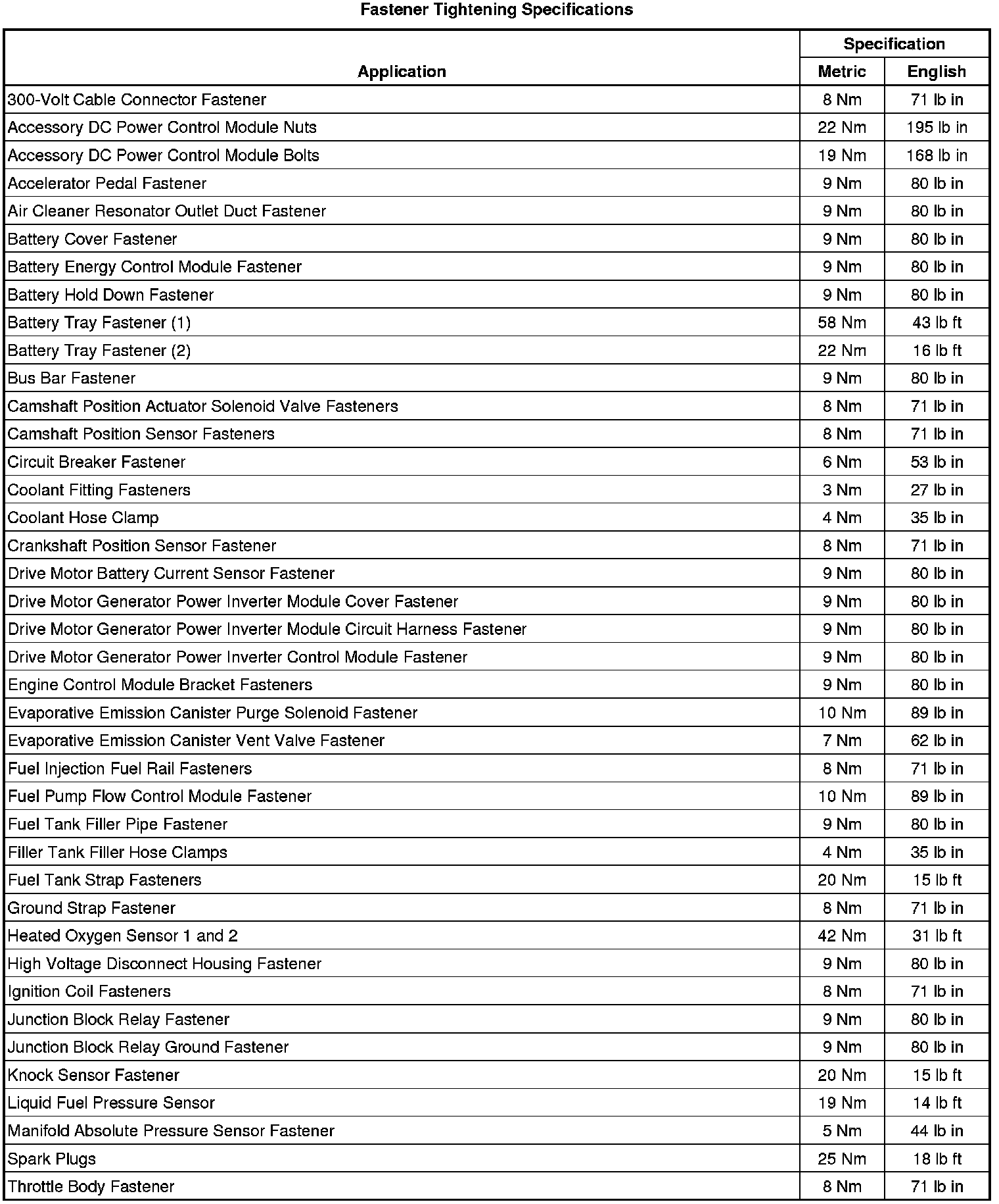 Fastener Tightening Specifications