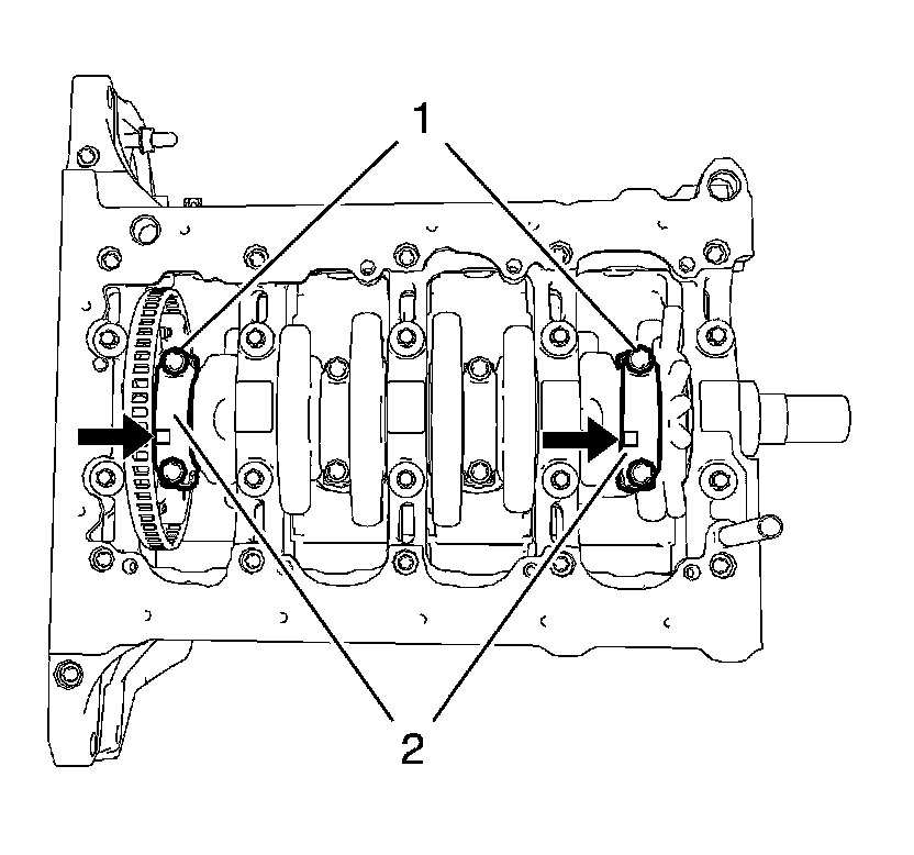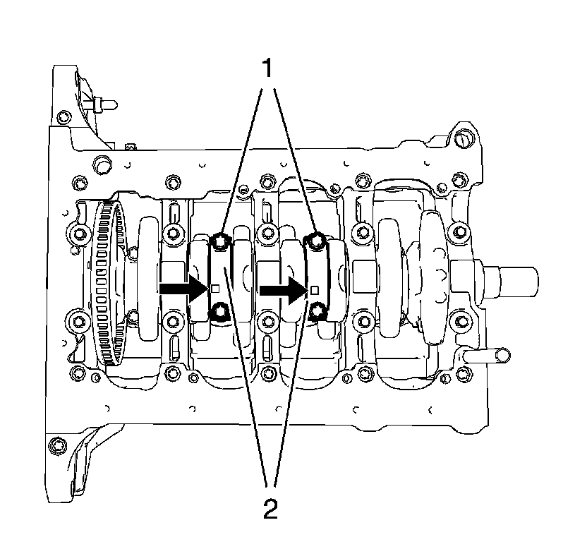Install the 2 connecting rod bearings and the 2 connecting rod bearing caps (2) of cylinder 1 and 4.