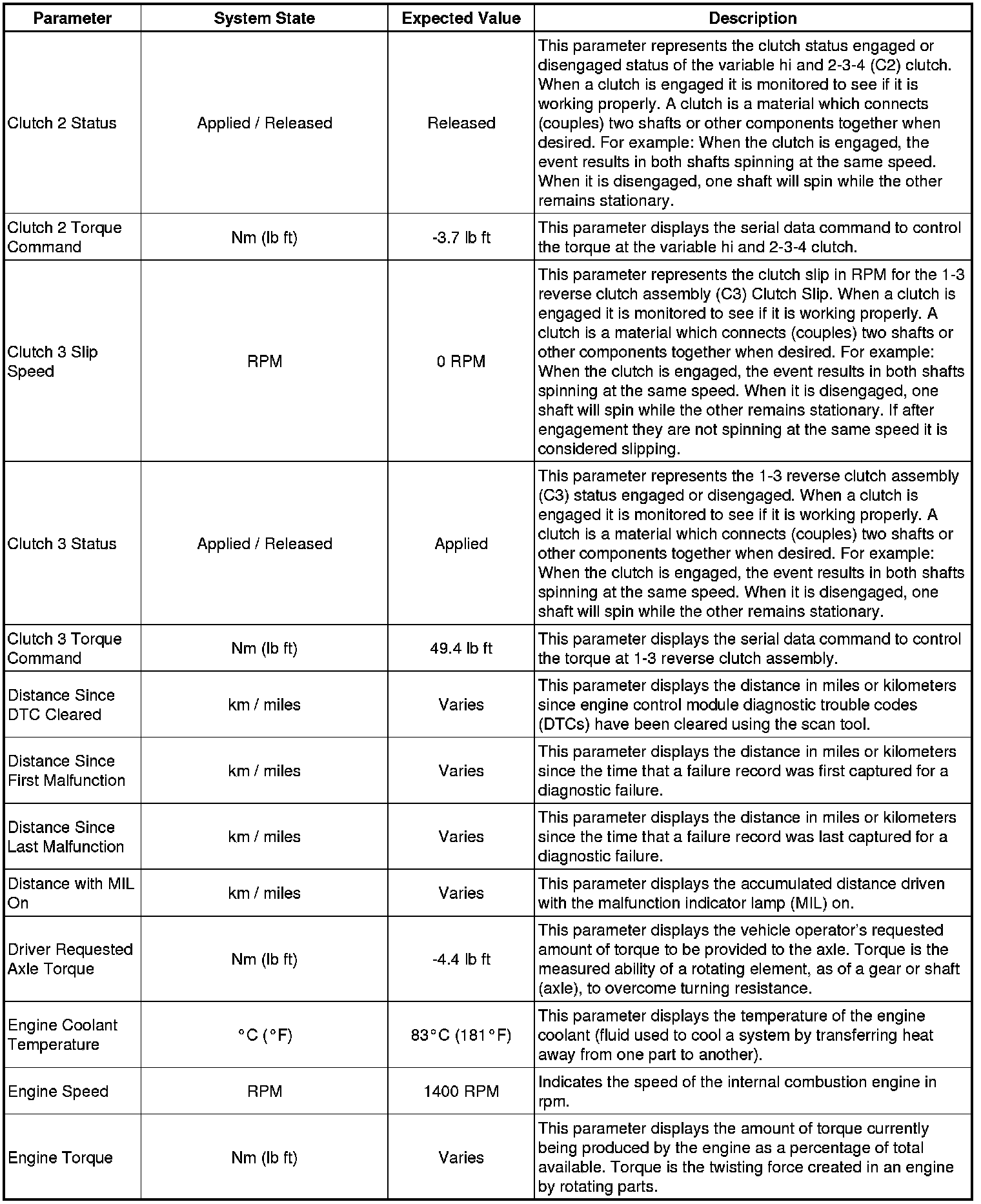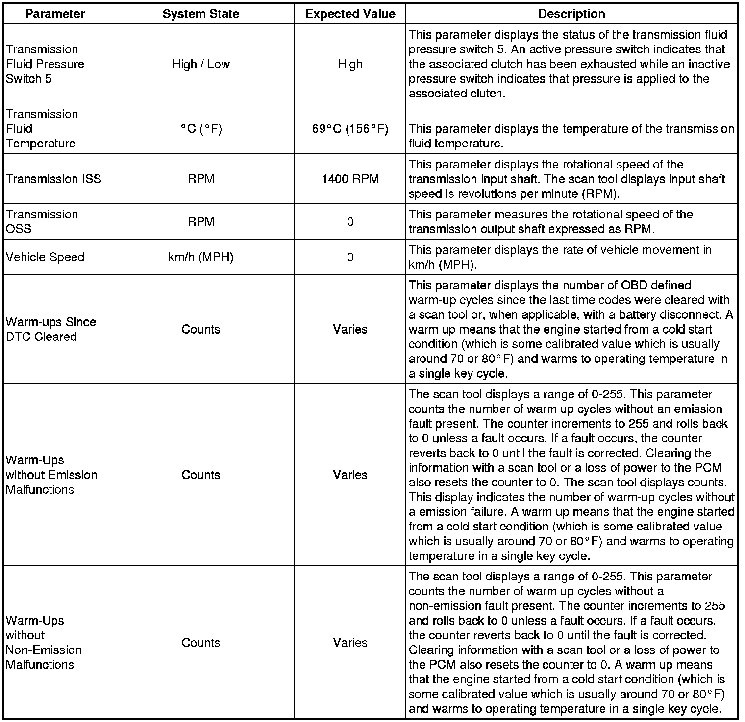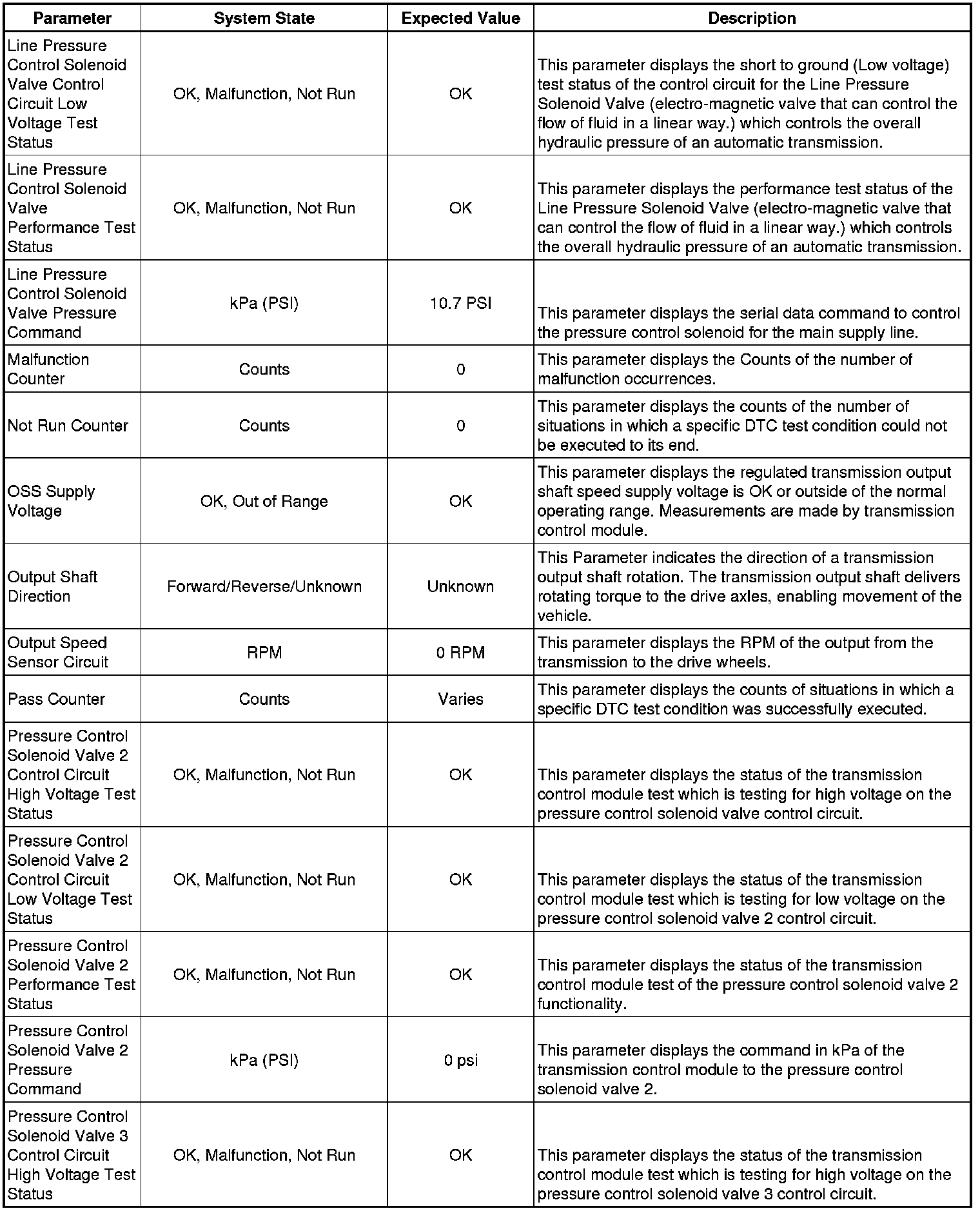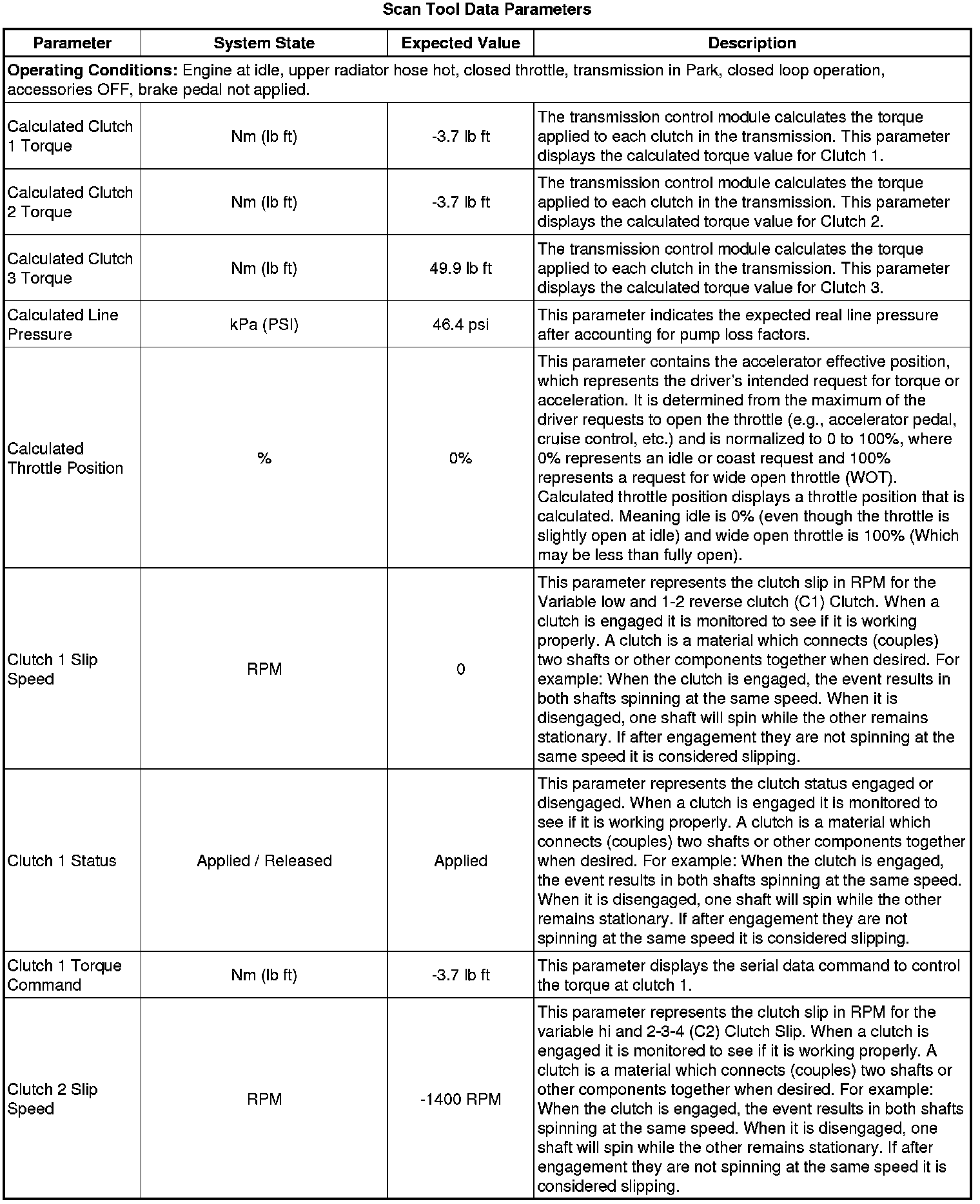 The Transmission Control Module Scan Tool Data List contains all transmission related parameters that are available on the scan tool. The list is arranged in alphabetical order. A given parameter may appear in any one of the data lists, and in some cases may appear more than once, or in more than one data list in order to group certain related parameters together.