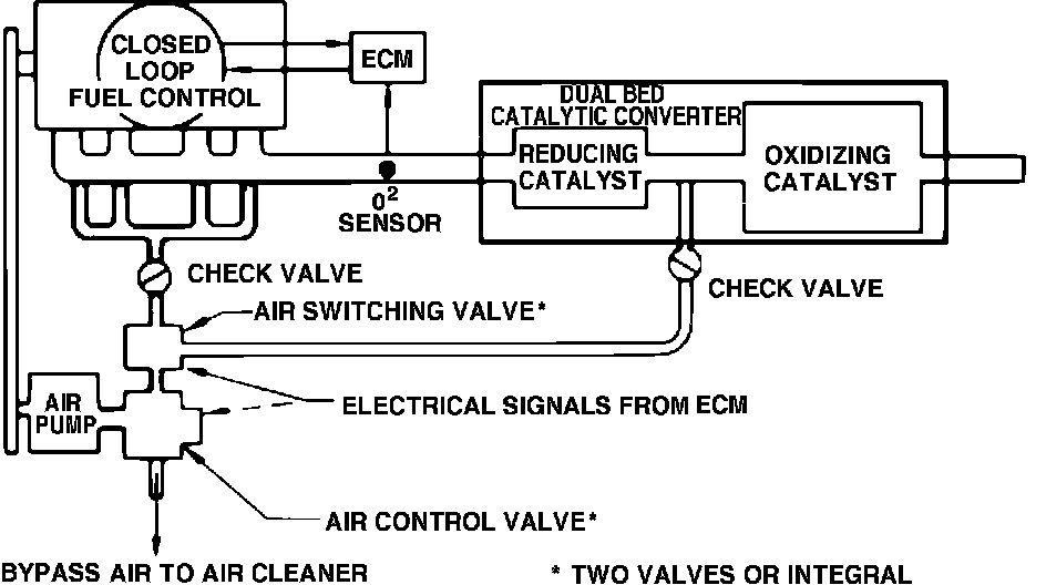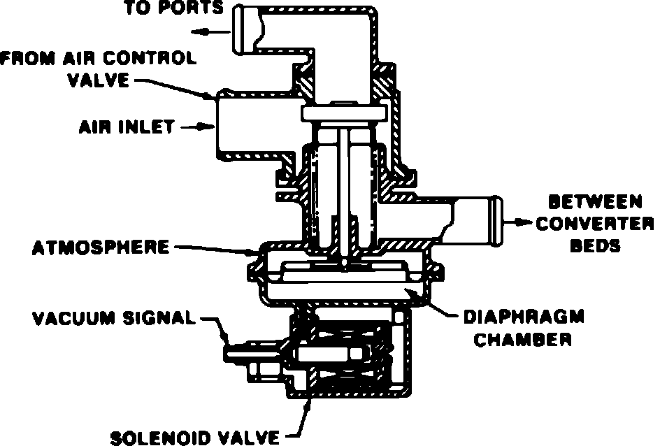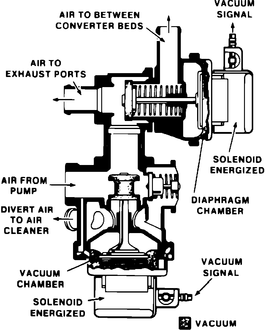 This system is used on models that do not require air injection into the catalytic converter, and is controlled by an Electronic Control Module (ECM). When engine is operating in ``Open Loop'' mode, the valve is energized and air pump output is directed to the exhaust ports. However, a sudden rise in manifold vacuum will close the valve, momentarily diverting air to the air cleaner. When engine is operating in ``Closed Loop'' mode, the valve is not energized and the vacuum signal is blocked. Air pump pressure closes the valve and air is diverted to the air cleaner.