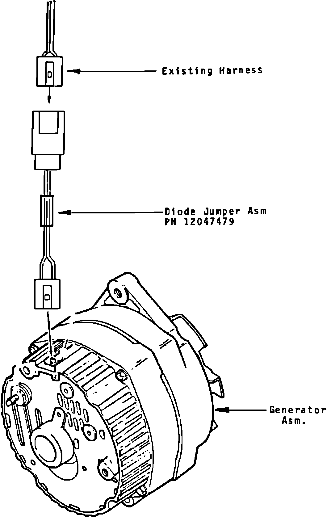 This condition can be caused by an electrical feedback from the generator light circuit back to the ECM. This condition can be corrected by installing a diode jumper assembly (see illustration), P/N 12047479, between the generator and the existing harness.