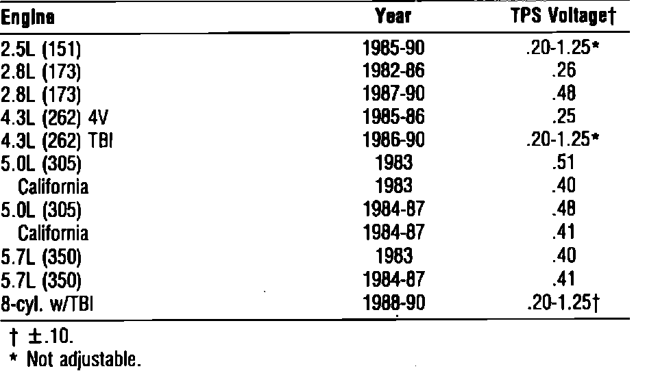 Carburetted Models: Remove aluminum plug covering the adjustment screw. Remove the screw and connect a digital voltmeter from the TPS center terminal to the bottom terminal. Apply thread locking compound tot he screw and with ignition on and engine not running (as applies), quickly adjust screw to obtain specified voltage at indicated condition.