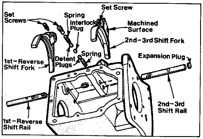 9. Place a detent spring and plug in case. Place 2-3 shift fork in synchronizer groove. Rotate fork into position and install 2-3 shift rail. It will be necessary to depress detent plug to enter rail in bore. Move rail inward until detent plug engages center (neutral) notch. Secure fork to shaft with set screw.
