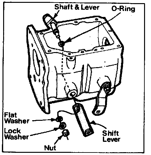 6. Install new 0-ring on each of two shift lever shafts. Lubricate shafts with transmission lube and install them in case. Secure each lever on its shaft with a flat washer, lock washer and nut.