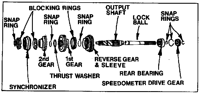 2. Slide low-reverse synchronizer, onto mainshaft with teeth end of gear facing toward rear of shaft. Secure in place with snap ring.