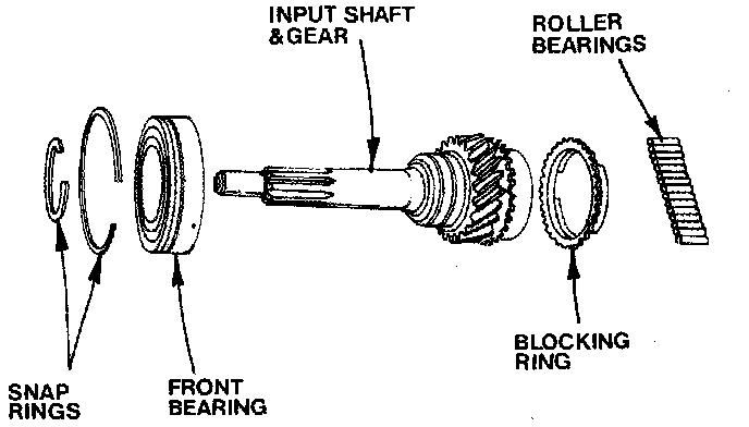 5. Coat tapered machined surface of 2nd gear with grease and slide blocking ring onto it. Slide 2nd gear with blocking ring and 2-3 synchronizer onto mainshaft. Tapered machined surface of 2nd gear must be toward front of shaft. Make sure that notches in blocking ring engage synchronizer inserts. Secure synchronizer with snap ring.