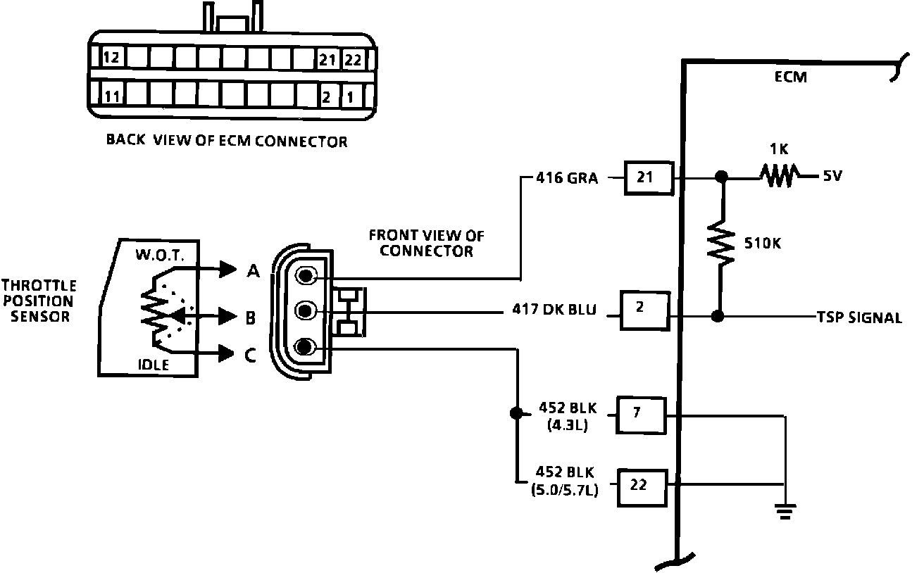 4. This step checks for a grounded circuit. Normal circuit should read about 5 volts. Checking for grounded TPS output to Terminal "2" of ECM, or short in CKT 417 and 452 from TPS, indicates whether fault is in wiring or ECM. A voltmeter with a 10 megohms resistance must be used for an accurate reading.