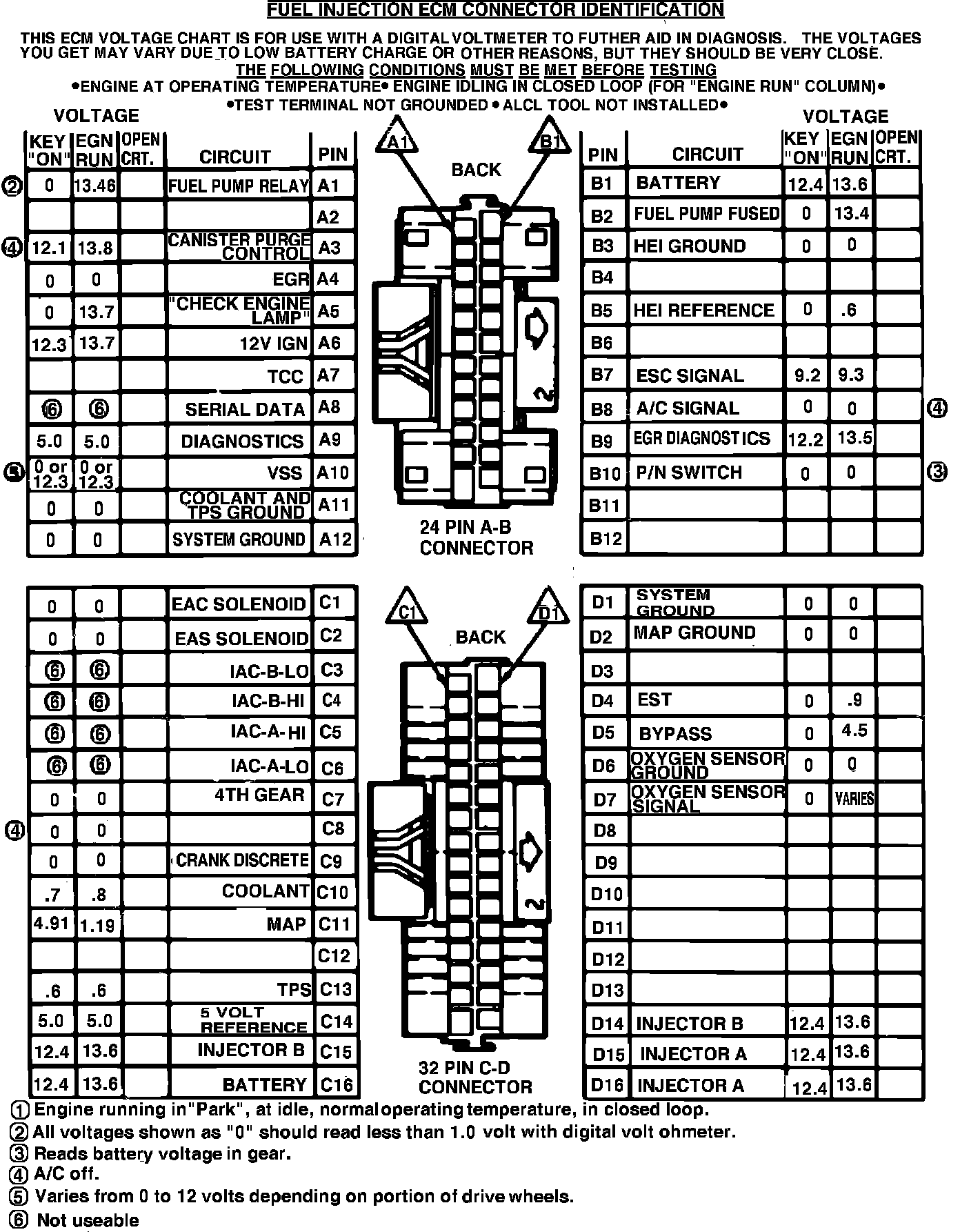 ECM Connector Terminal Identification & Voltage Specifications.: