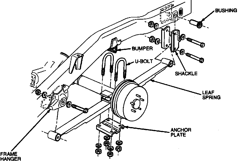 10. Reverse procedure to install. Torque shock absorber nut, U-bolt nuts and lower spring shackle bolts to specification.