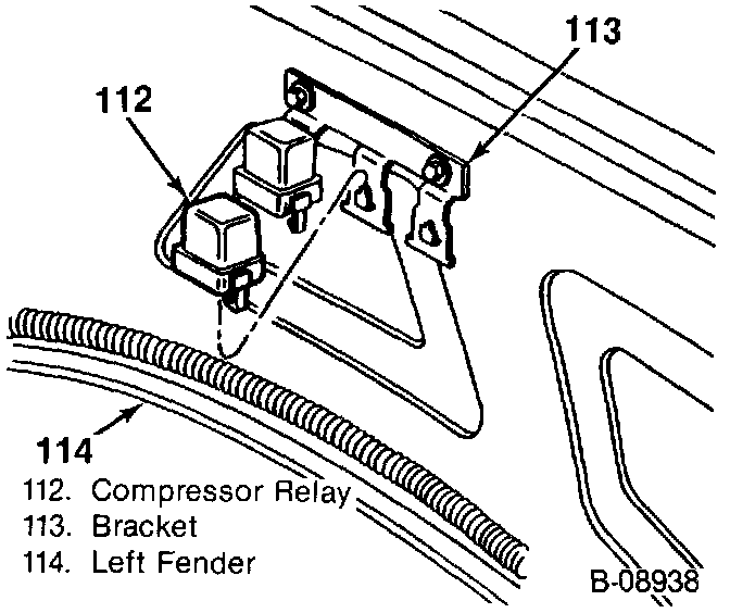 The Compressor Cut-Off Relay is located on the LH fender on the relay bracket.