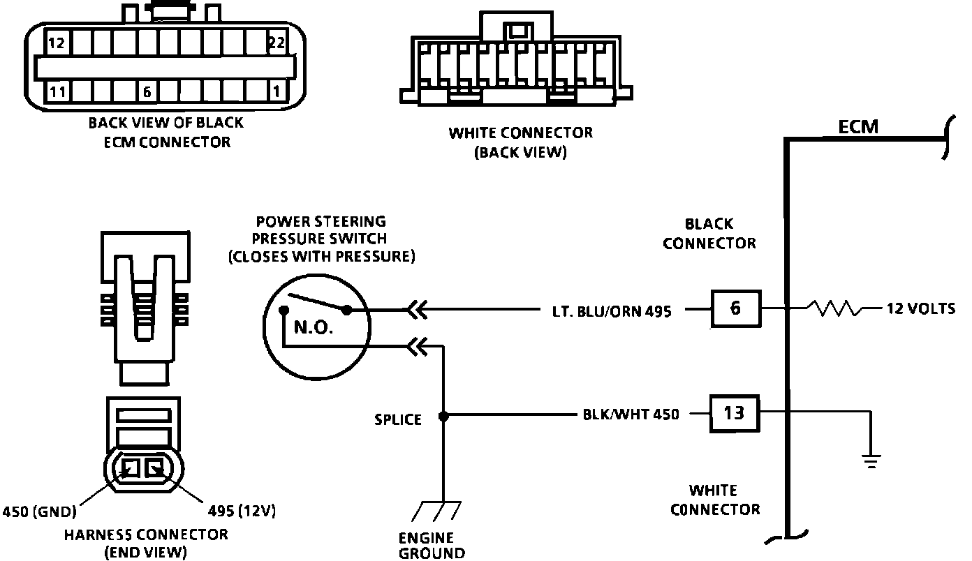 ^ A pressure switch that will not close, or an open CKT 495 or 450, may cause the engine to stop when power steering loads are high.