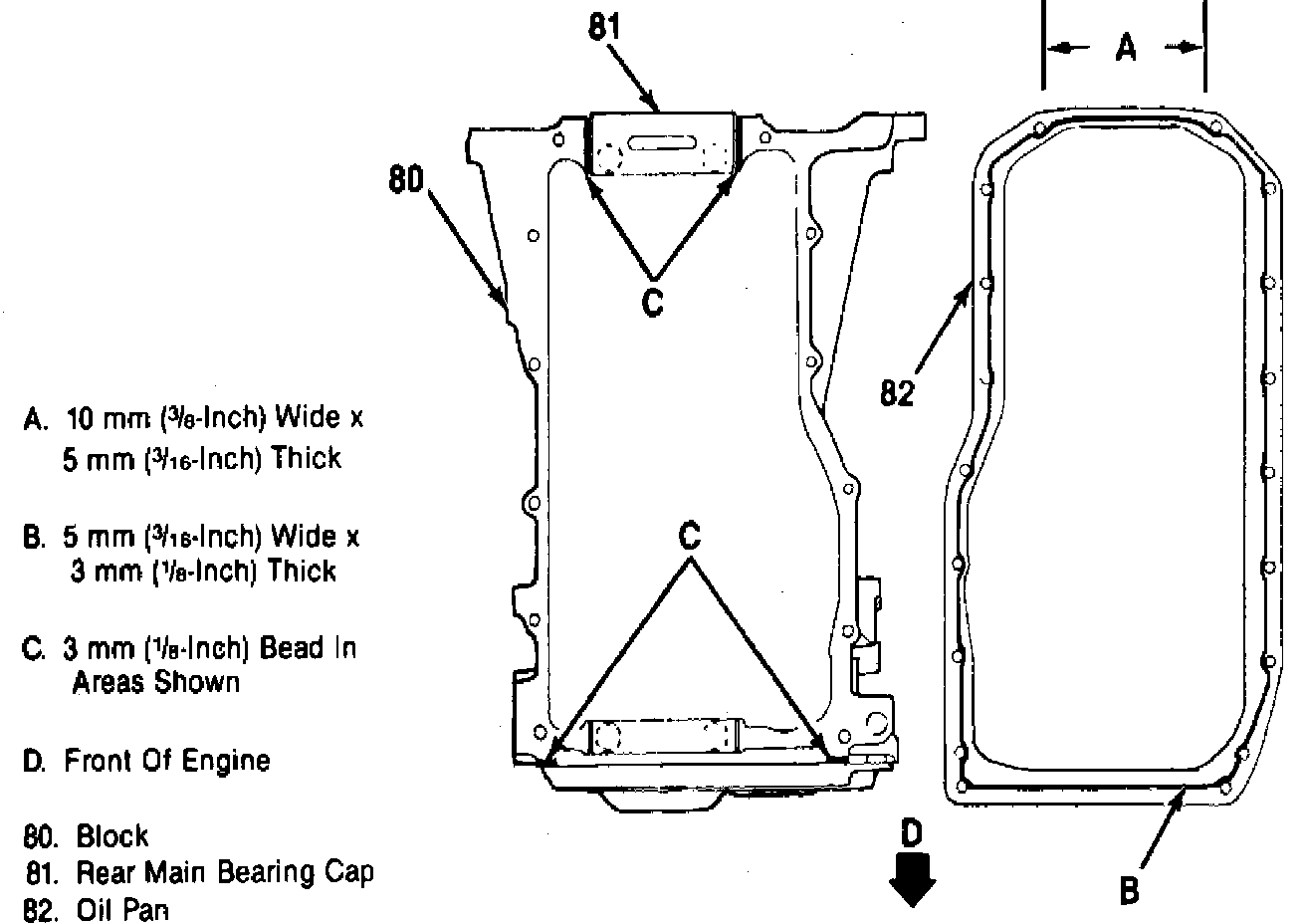 c. On 1985 models, apply a 1/8 inch bead of RTV sealant to entire oil pan sealing flange.