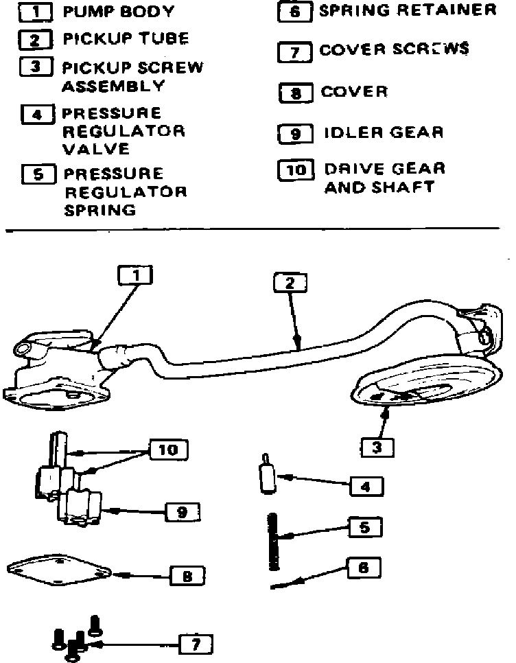 2. Remove pressure regulator valve and valve components. Do not remove the oil pickup tube in relation to the pump body or screen.