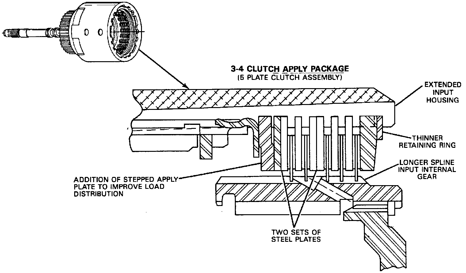 NOTE: A new 3-4 clutch apply package is now in production starting February 9, 1987. A new 3-4 clutch apply plate (stepped) replaces a flat apply plate. The input housing and shaft assembly is revised with longer housing splines for using the new 3-4 clutch apply plate. A new input internal gear with longer splines on the outside diameter is used. This package also eliminates usage of the longer 3-4 clutch apply ring (now using only the short 3-4 clutch apply ring on all models). New 3-4 backing plates are used. A new internal retaining ring (thinner and end configuration is changed or identification. The changes described here only apply to transmissions built after February 9, 1987 (Julian date 040).