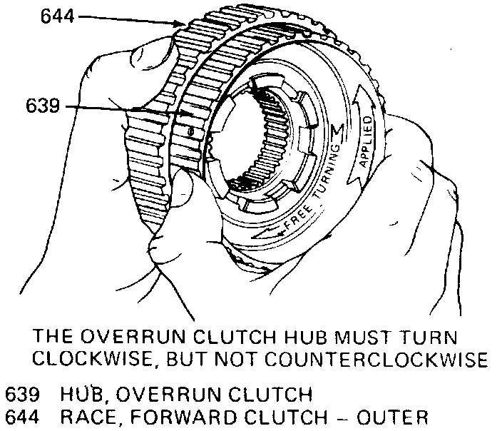 1. Remove forward sprag outer race, then the overrun clutch hub retaining snap ring and clutch hub.