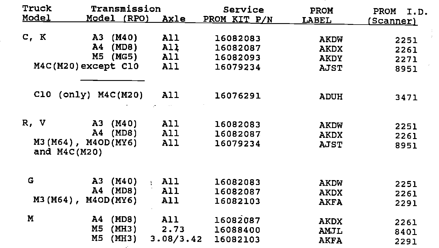 I.D., determine if the vehicle has the appropriate calibration PROM as listed in the table below. If the vehicle is not equipped with the calibration PROM listed, install the PROM specified.