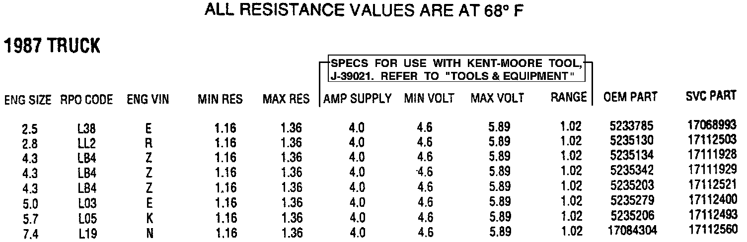 Injector Resistance, Application Chart & J-39021 Tester Values