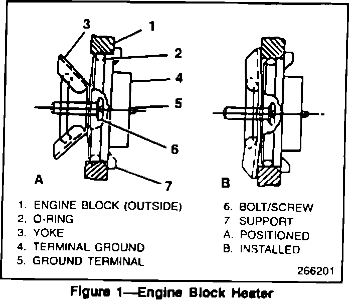 The block heater brass yoke may crack due to stress corrosion where it contacts the stainless steel crossbar. The yoke is stressed or cracked from over torquing the hold down screw (Figure 1, "6"). Corrosion in the stressed area is accelerated due to the dissimilar metals.