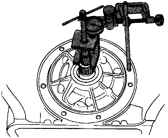 4. Zero dial indicator, then pull up on checking fixture. Endplay should be 0.005-0.036 inch. If dial indicator shows no endplay, then selective washer and thrust bearing have been improperly assembled.