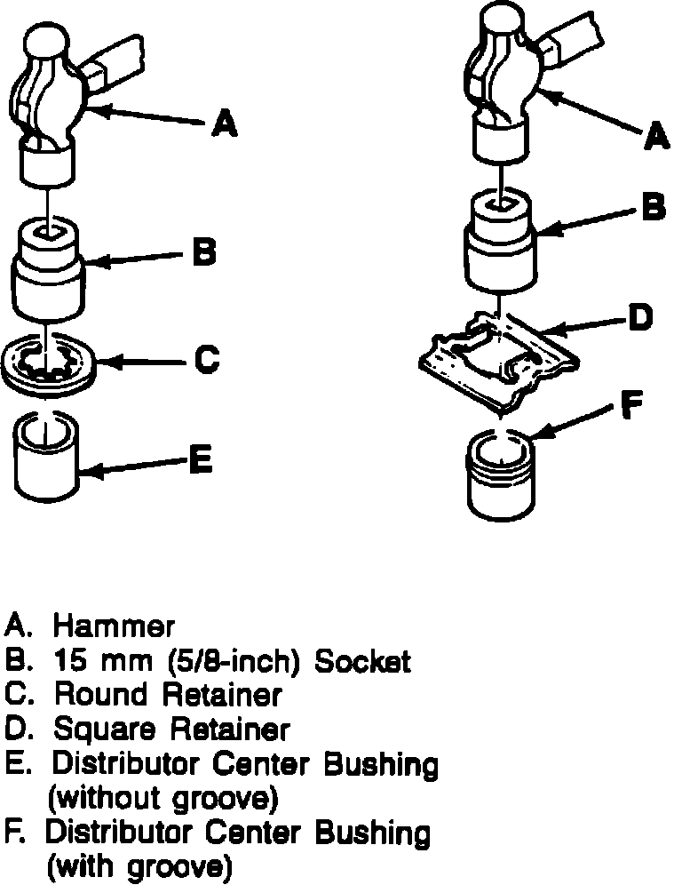 NOTE: Use a new round retainer if center bushing in distributor base has no groove around the outside. Use a new square retainer when there is a groove in center bushing.