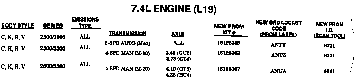 Some 1987-88 C/K and R/V trucks with 7.4L engines may experience customer comments of engine surge. If the condition described cannot be repaired using normal service procedures, a revised calibration PROM should be installed (see chart). Parts are currently available from GMSPO.