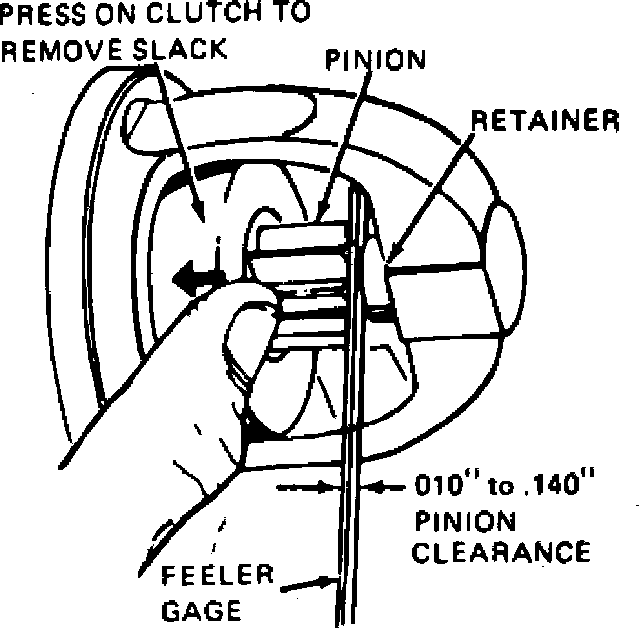 There is no provision for adjusting pinion clearance on this type motor. When the shift lever mechanism is correctly assembled, the pinion clearance should fall within the limits of .010 to .140 inch. When the clearance is not within these limits, it may indicate excessive wear of the solenoid linkage or shift lever yoke buttons.