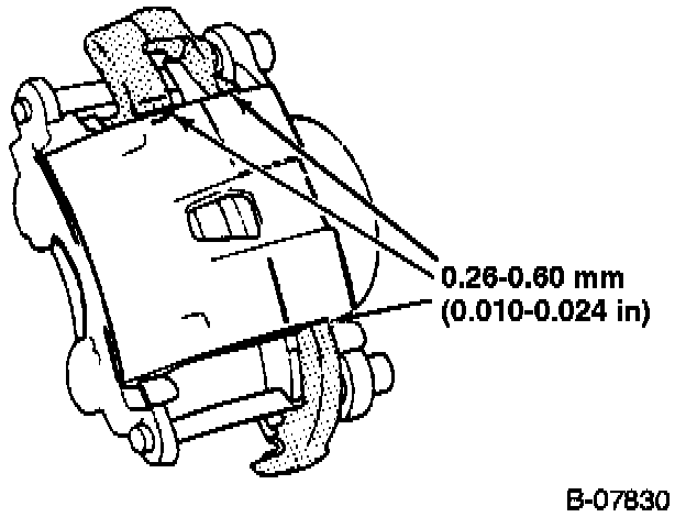 8. Measure the clearance between the caliper and the steering knuckle. The clearance at each end of the caliper should be measured individually and added together. this total should be between 0.26-0.60 mm (0.010-0.024 inch).