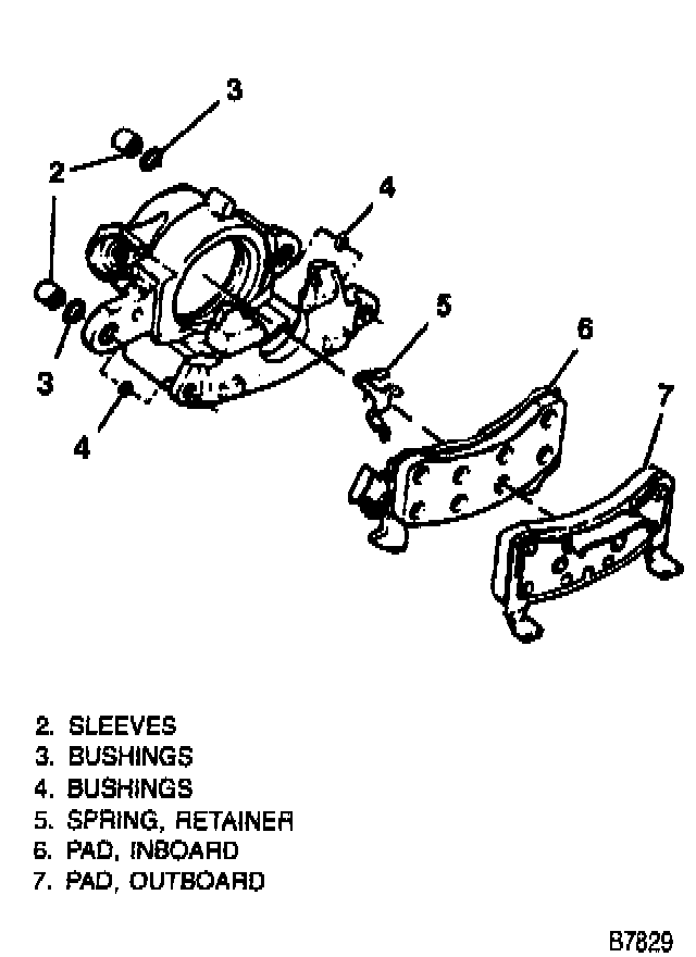 2. Install new bushings and sleeves on caliper ears. Position the sleeve so that the end toward the pad is flush with the machined surface of the ear.