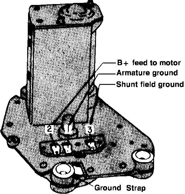 When ignition is on, battery voltage is supplied to motor terminal 2, Fig. 2. Current flows through the series field to a splice where it is divided, and part passes through the armature and part through the shunt field. The armature and shunt field circuits are completed to ground through the wiper switch, with motor speeds determined by resistance in the shunt field ground path.