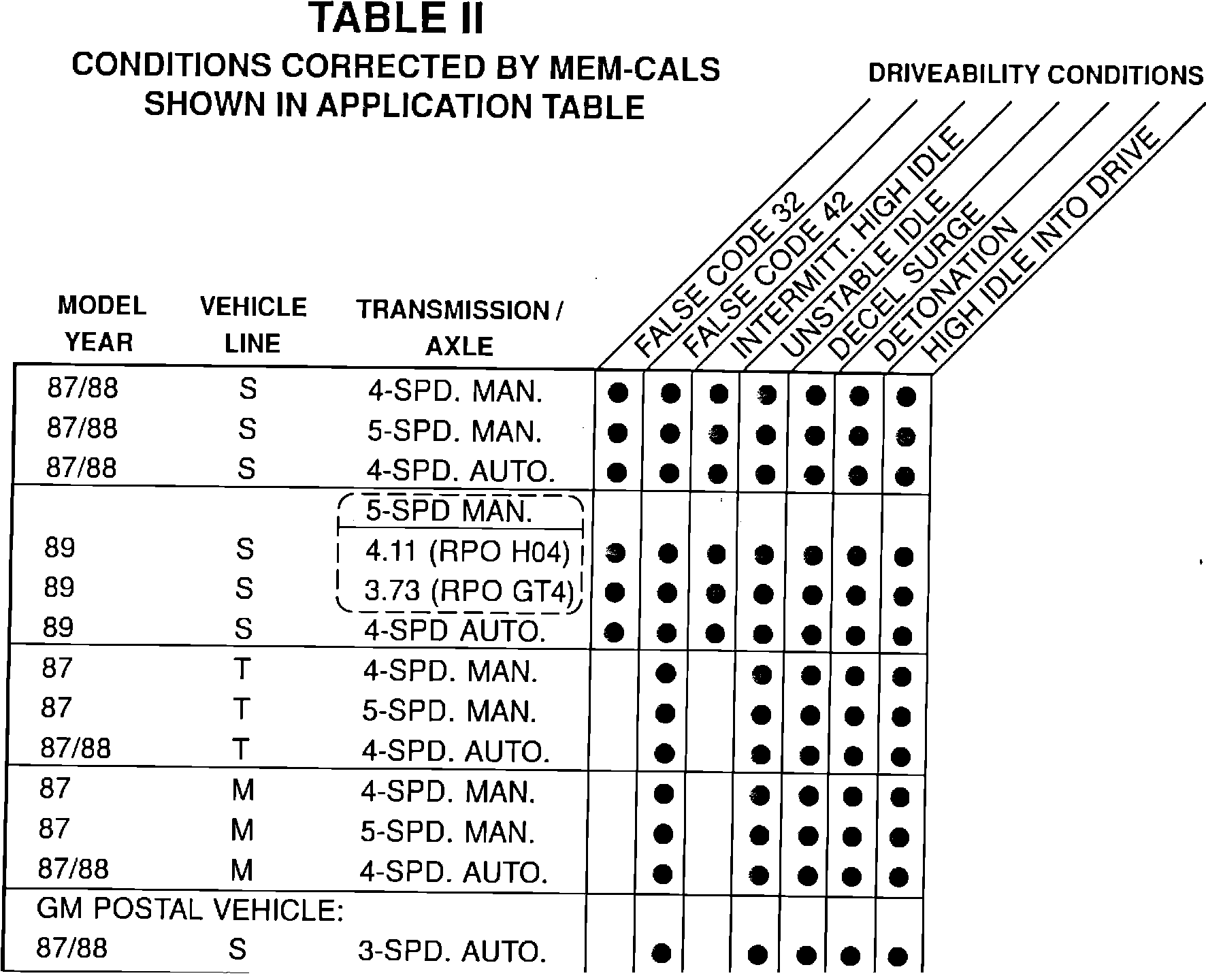 If these conditions are experienced and can not be corrected through normal service procedures, they may be repaired by installing the appropriate MEMCAL kit as shown in Table I, "Application Table". The driveability and false code conditions that are corrected by the MEMCAL kits for each specific vehicle application are shown in Table II.