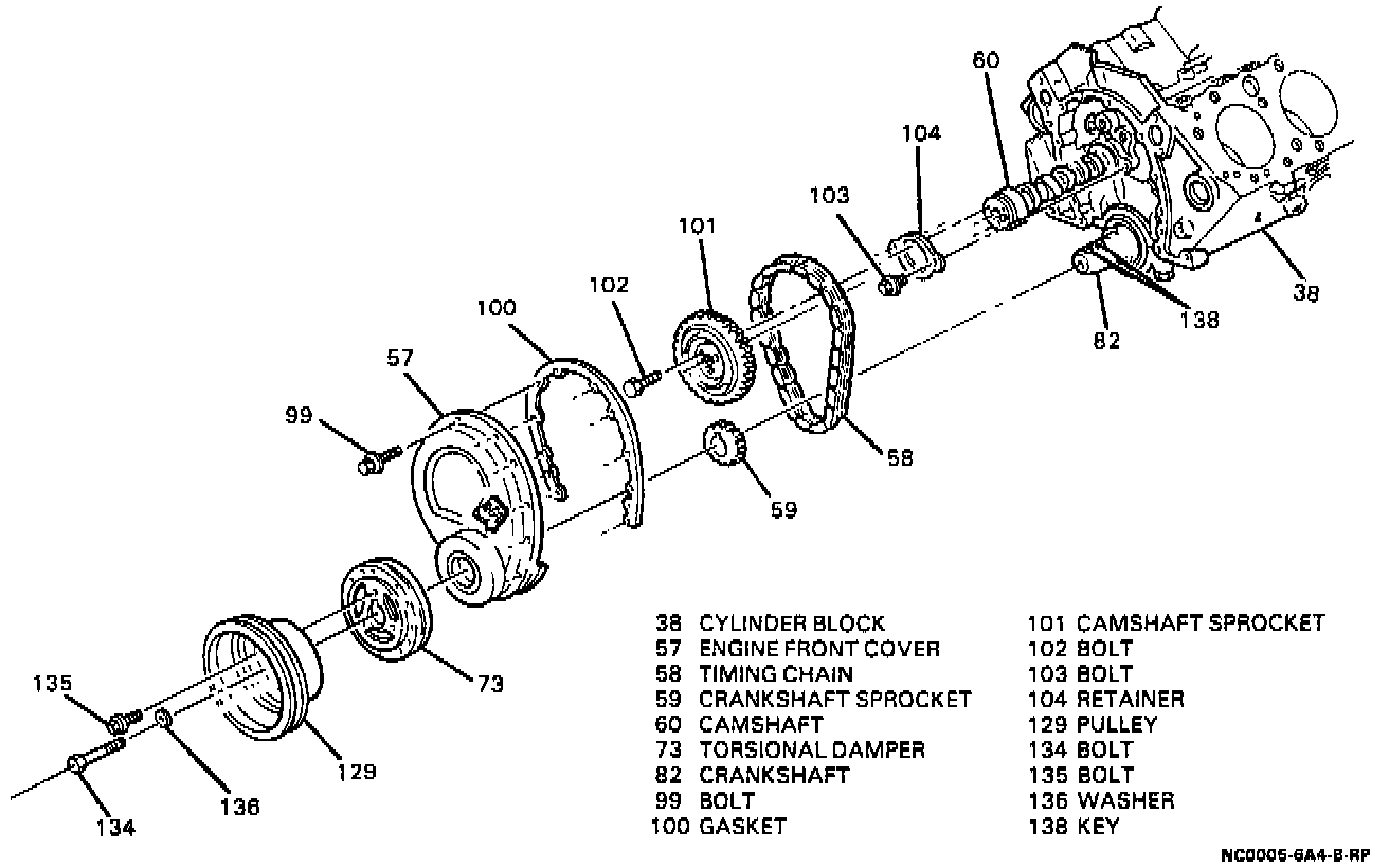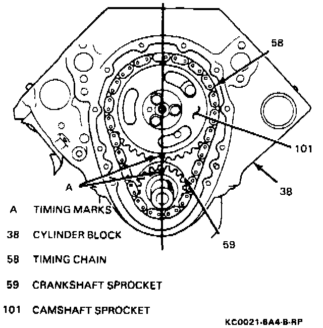 2. Ensure that the timing marks on the crankshaft sprocket (59) and camshaft sprocket (101) are as close together as possible and lined up with the shaft centers.