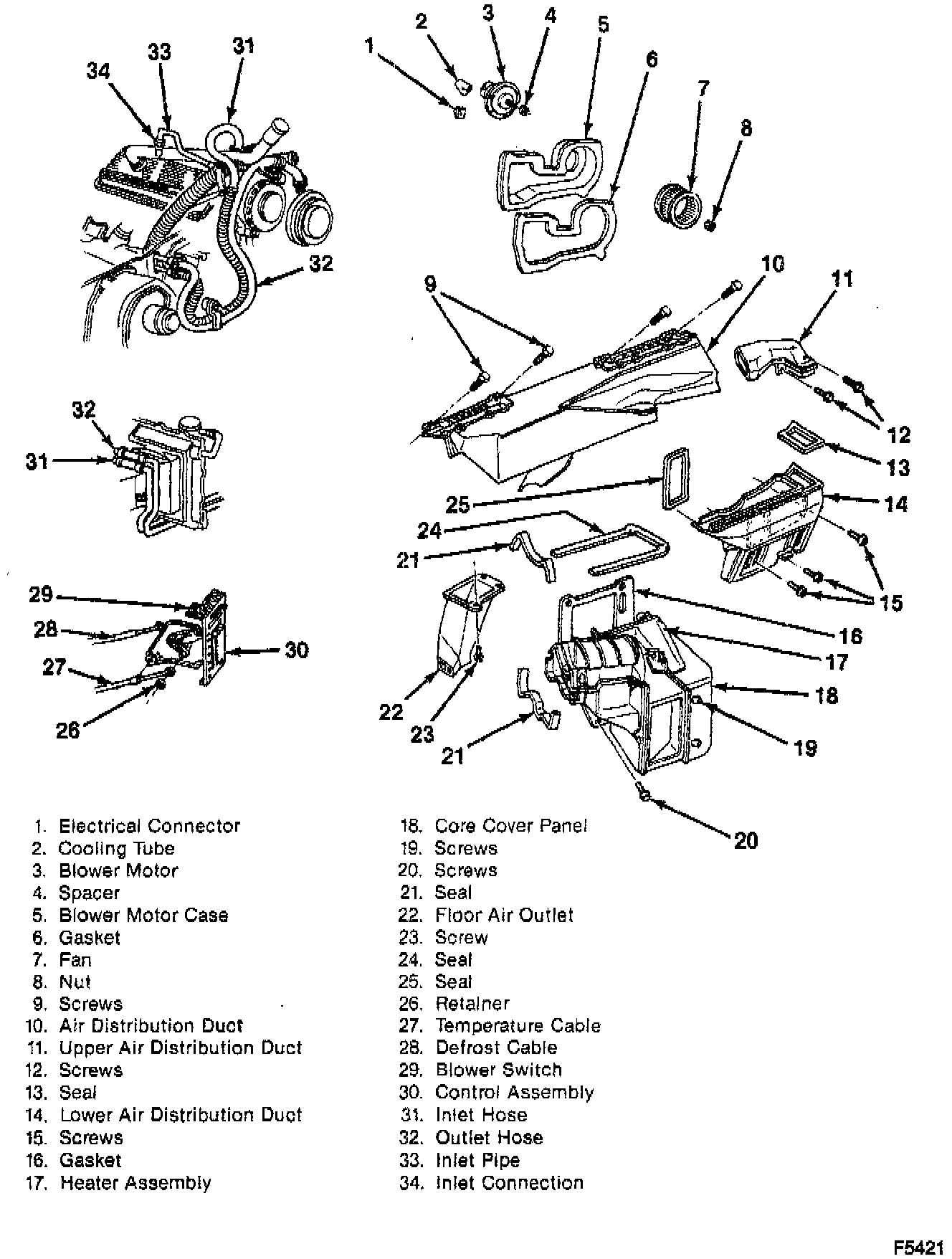 In the "HTR" (heater) and defrost mode, outside air is driven by the blower to the temperature door which, depending upon its position as controlled by the operator, distributes all or some portion of the inlet air through the heater core. The vent door will prevent air entry into the vent duct and direct this ambient air to the mix portion of the heater module. The air is thus heated, mixed, and then directed into either the defroster duct or the heater outlet by the position of the mode valve and control lever. A small amount of air is bled to the side window defogger system.