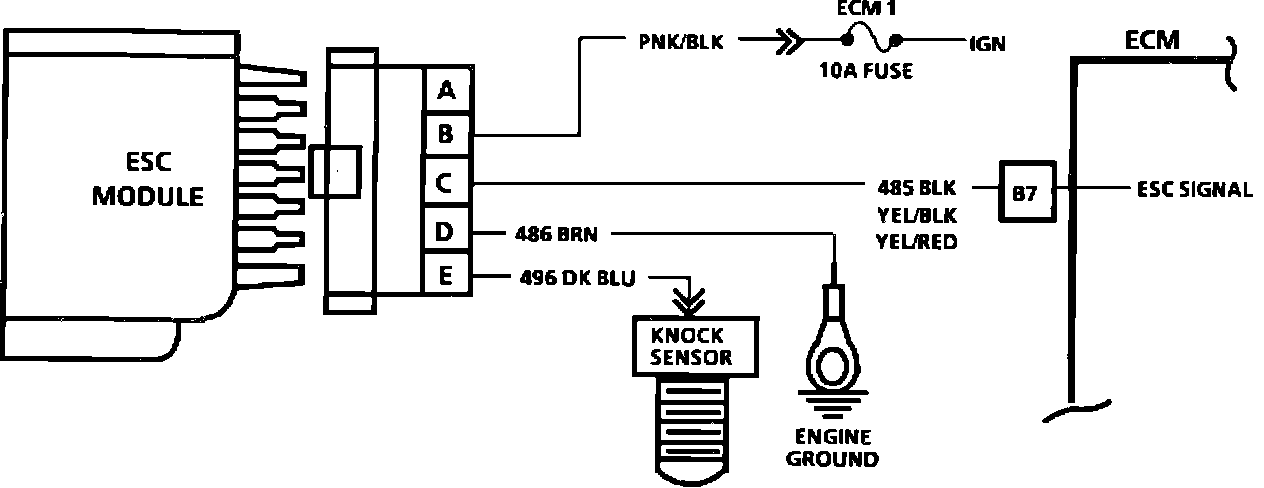 5. Contacting CKT 496, with a test light to 12 volts, should generate a knock signal to determine whether the knock sensor is faulty, or the ESC module can't recognize a knock signal.