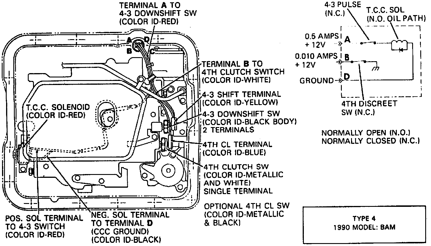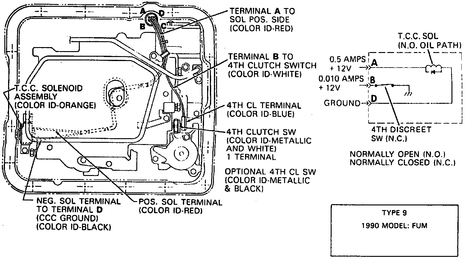 16. Select the proper transmission model code from the images - the model code designation is found within a box in the image. Correctly route and connect solenoid assembly wiring. The wire connectors are color coded to correspond to the information in the wiring diagram. On switches which take two connectors, the terminals are reversible.