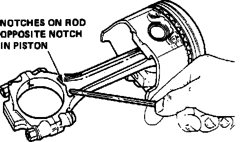 There are two notches in the piston crown. When assembling pistons onto connecting rods, position rod so that raised notch side of rod at bearing end, Fig. 8, is opposite notch in piston crown. Install piston and rod assemblies in engine block with notches in piston crowns facing front of engine. After installation, check connecting rod side clearance. If clearance is not .006-.022 inch, connecting rod should be replaced.