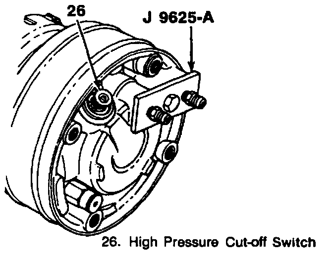 ^ Install J 9625-A onto the rear head of the compressor and connect gage charging lines, or pressurize suction side (low pressure side) of compressor on vehicle with Refrigerant-12 vapor to equalize pressure to the drum pressure. Temporarily install the shaft nut and with the compressor in a horizontal position and using a wrench, rotate the compressor shaft in normal direction of rotation several times by hand. Leak test the seal and correct any leak found. Remove, discard and later replace with a new shaft nut.