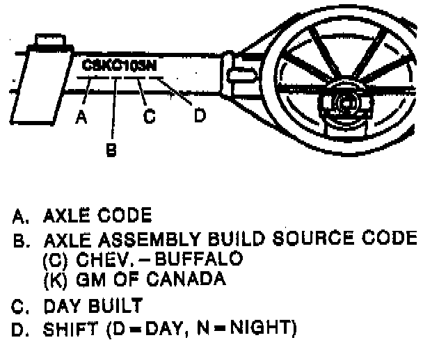 All corporate rear axles are identified by a broadcast code or part number on the right axle tube near the carrier. The rear axle identification code and manufacturer's code must be known before attempting to adjust or repair axle shafts or the rear axle case assembly. Rear axle ratio, differential type, manufacturer, and build date information is stamped on the right axle tube on the forward side. The first three digits indicate the rear axle ratio. The next digit indicates the axle assembly build source code: (C) Buffalo and (K) Canada. The next three digits indicate the day built, displayed in Julian Date form. The last digit indicates the shift: (1) First and (2) Second. Any reports made on rear axle assemblies must include the full code letters and build date numbers.