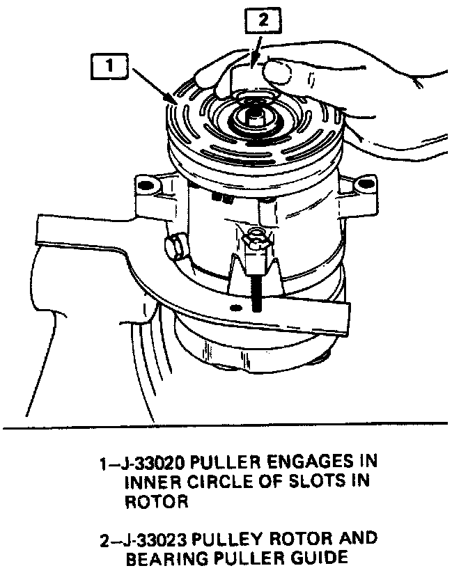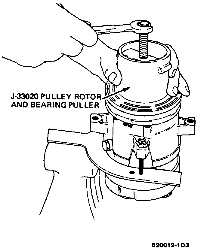4. Hold the J-33020 puller in place and tighten the puller screw against the puller guide to remove the pulley rotor and bearing assembly.
